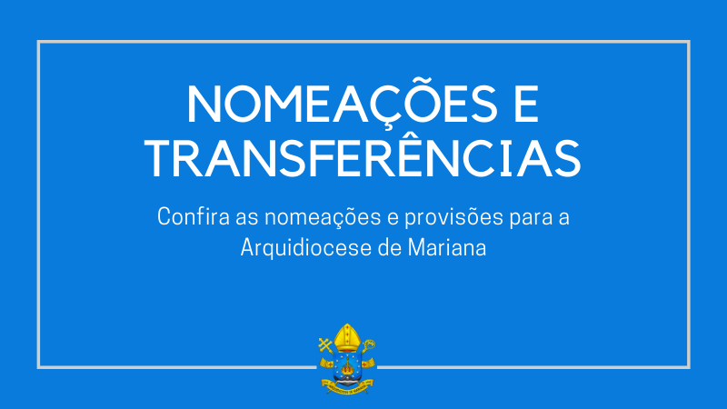 Considerando as necessidades pastorais e a adequada distribuição dos ofícios eclesiásticos, seguindo o que prescreve a disciplina da Igreja, o direito particular e os legítimos costumes de nossa Arquidiocese de Mariana, o Exmo. Sr. Arcebispo, Dom Airton José dos Santos procedeu às seguintes nomeações e provisões que, oportunamente, se regerão pelas determinações dos respectivos Decretos.