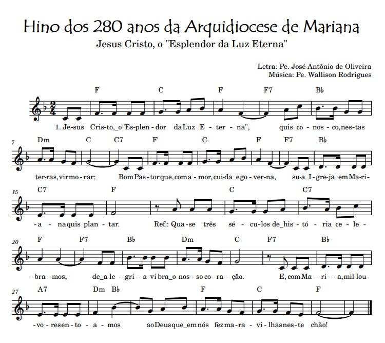 Clique aqui e baixe, em PDF, a partitura do Hino dos 280 anos da Arquidiocese de Mariana.