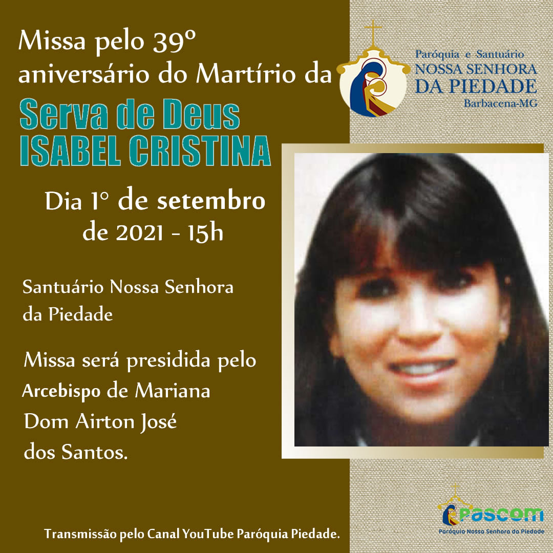 Nesta quarta-feira, 01 de setembro, quando se completam 39 anos do martírio da Serva de Deus Isabel Cristina, uma missa presidida pelo Arcebispo Metropolitano de Mariana, Dom Airton José dos Santos, marcará a data. A celebração será a partir das 15h no Santuário de Nossa Senhora da Piedade, em Barbacena (MG).