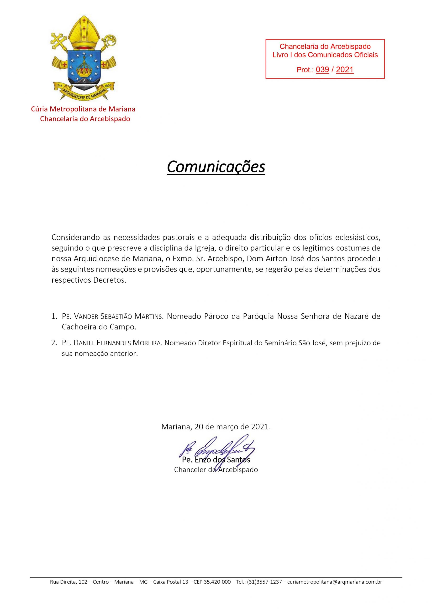 Veja as novas nomeações para a Arquidiocese de Mariana.